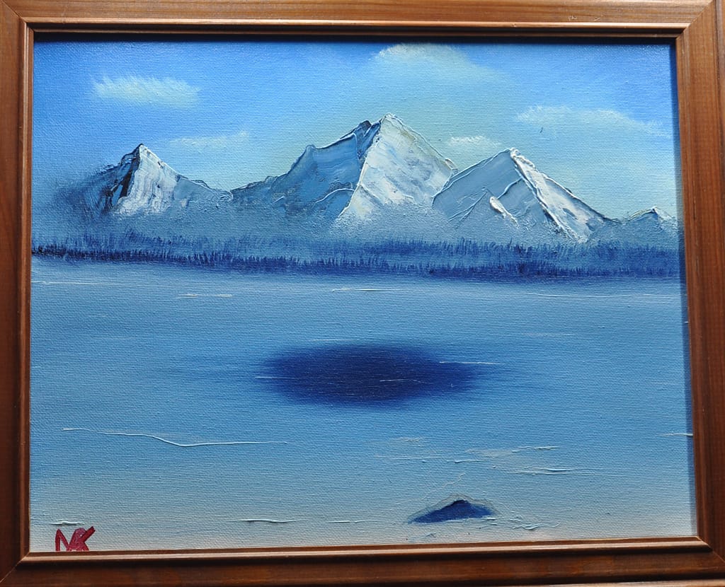 At the time, I was struggling with a big decision that I needed to make. This painting is of a view of the outside through a cabin’s front door window. The path forward slightly obscured and curved through the snow and fog, yet the path is marked out and a signpost delineates the available paths ahead. The subtle hints of frost visible at the raised corners are intended to portray the glass and the first step not yet taken towards the difficult choice.