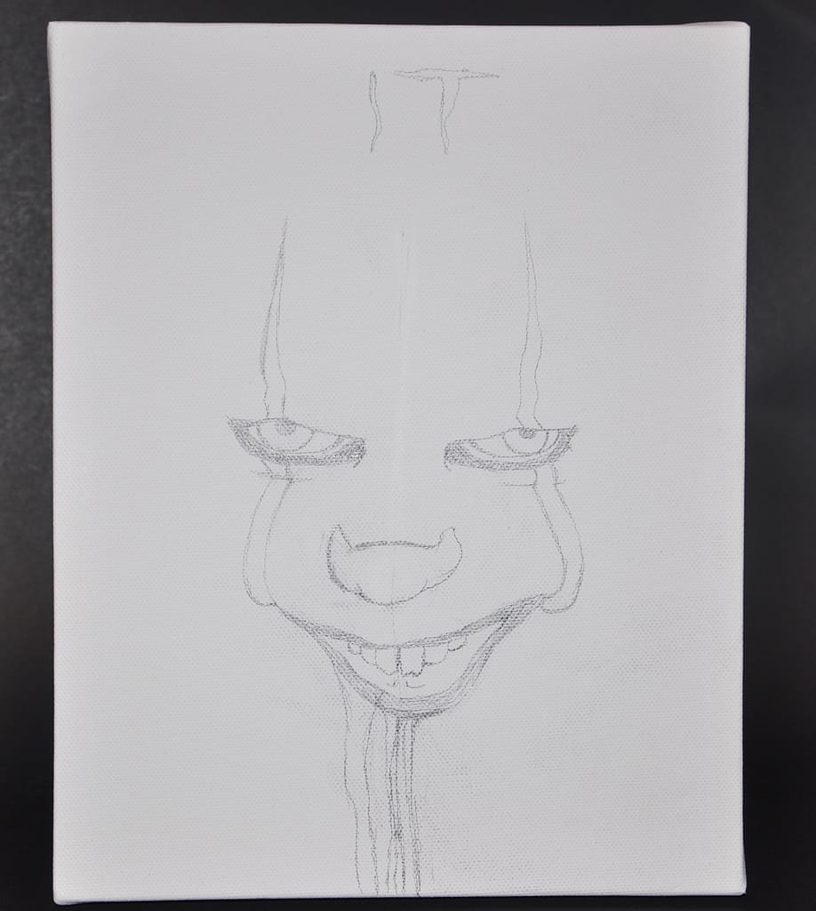Above is the sketch based of an “IT” movie poster. I used a pensile so I could erase any mistakes and it should be difficult to notice under the painting.